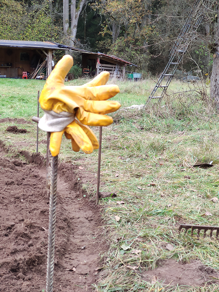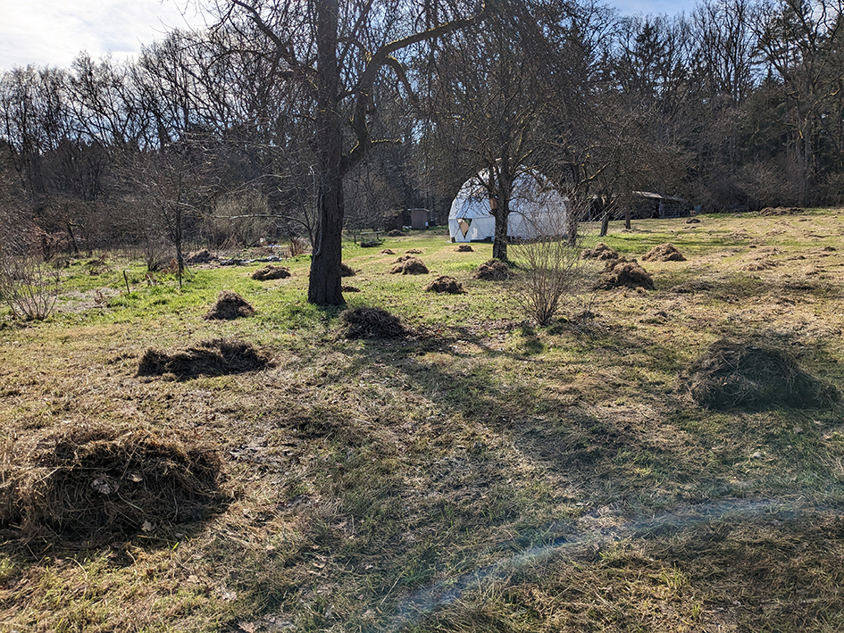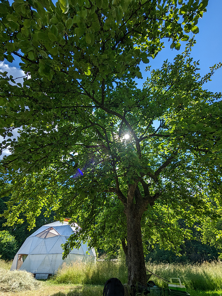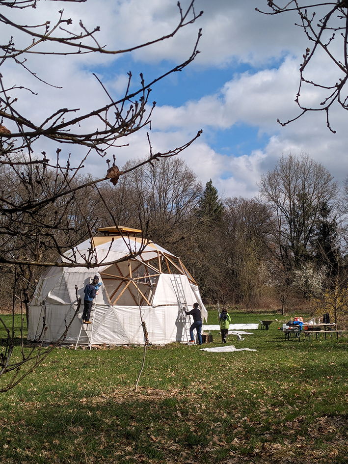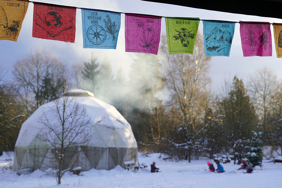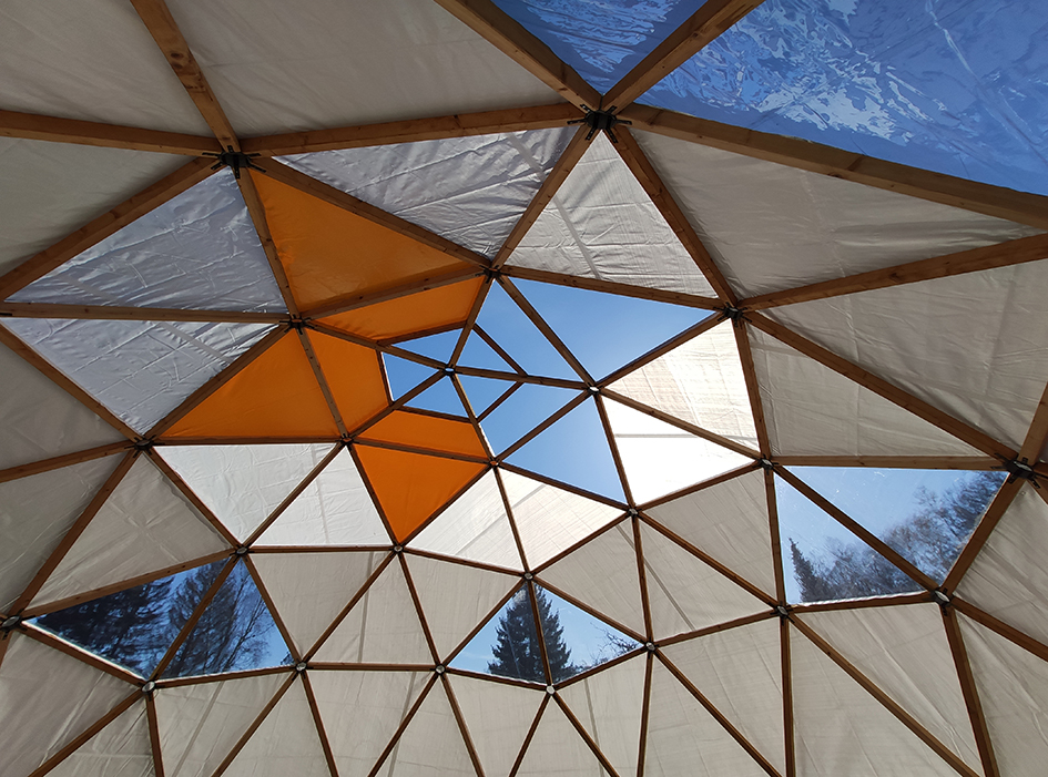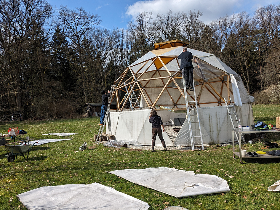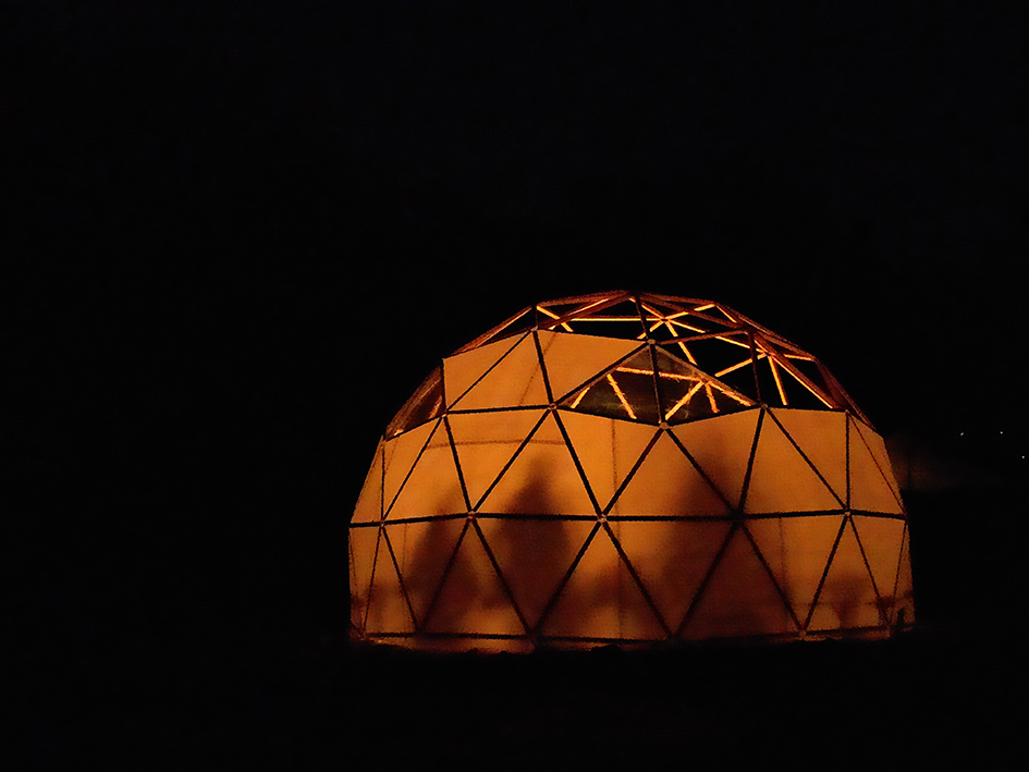 Auf dem Gelände befindet sich eine große geodätische Kuppel – unser Geodome – welcher mit einer offenen Feuerstelle beheizbar ist. Er bietet Schutz und Rückzug für bis zu 30 Personen.