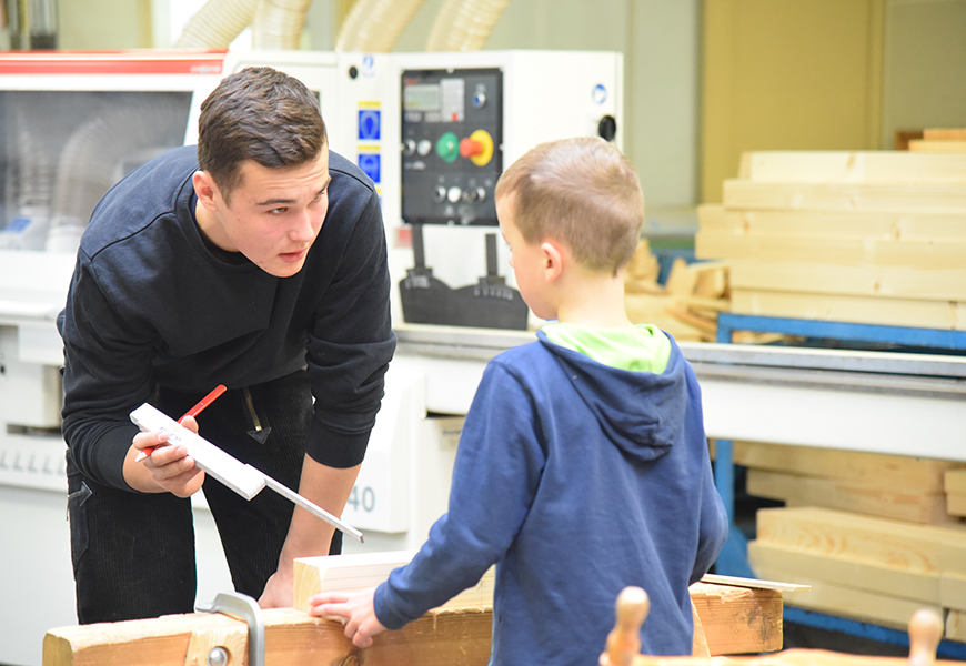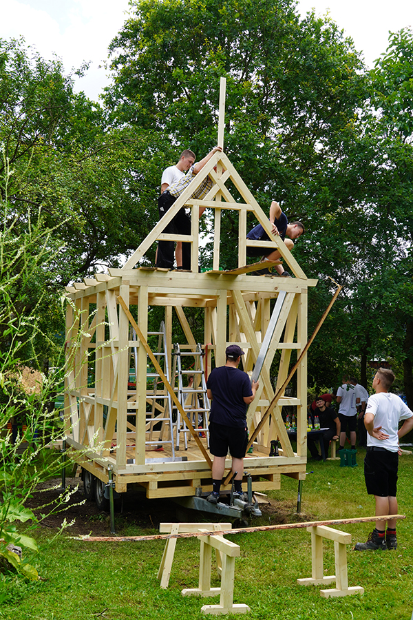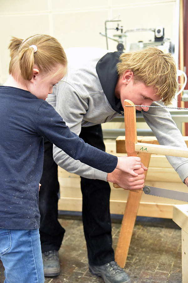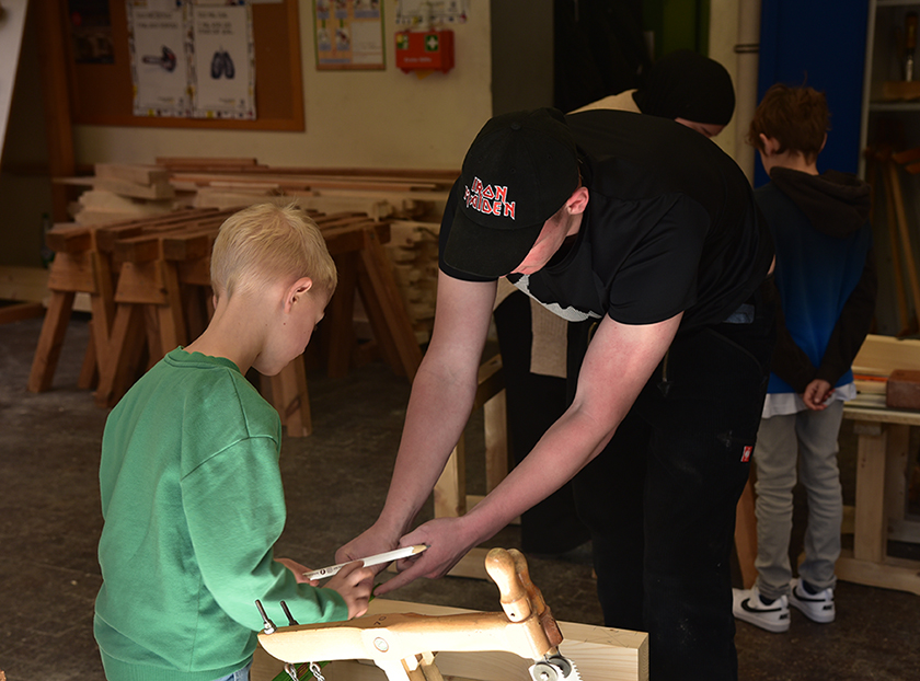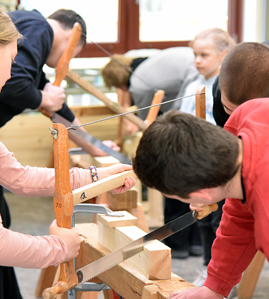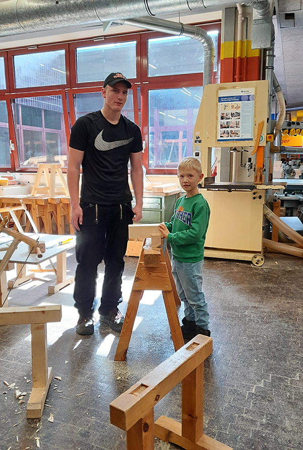 Auch durften die Kinder selbst erfahren, dass Einiges dazu gehört, bis so ein kleines Haus wirklich stehen kann. Eingeladen in die Werkstatt der B11, haben die Kinder selbst Hand an die Säge angelegt und ihr eigenes Werkstück in gemeinsamer Arbeit und mit der Anleitung der jungen Zimmerer erstellt.