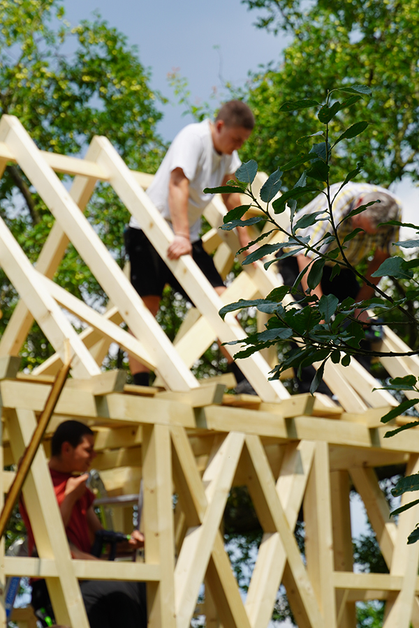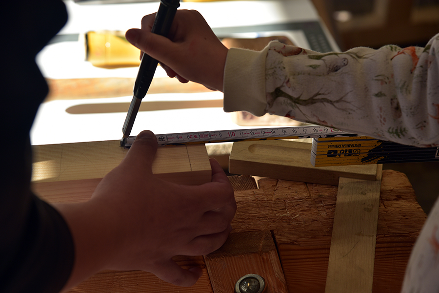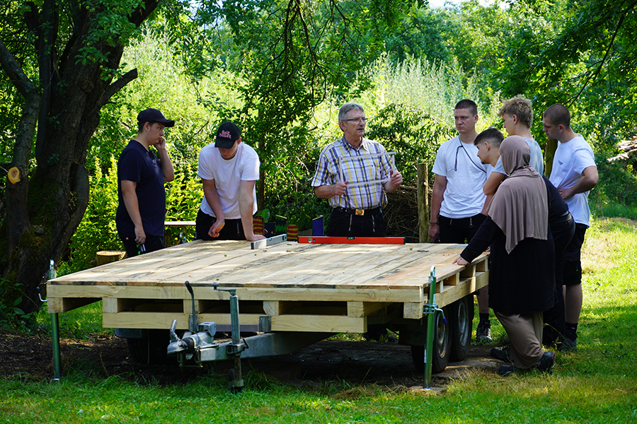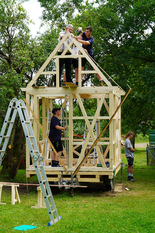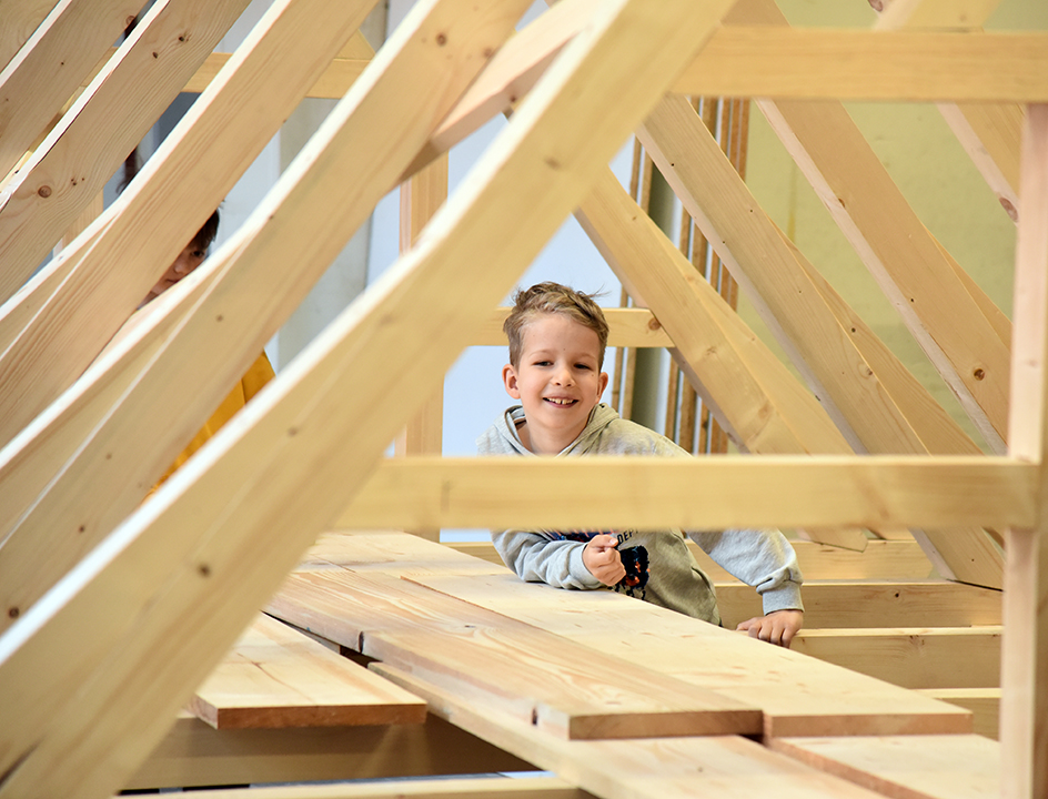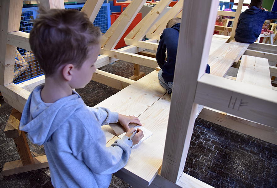 Auch durften die Kinder selbst erfahren, dass Einiges dazu gehört, bis so ein kleines Haus wirklich stehen kann. Eingeladen in die Werkstatt der B11, haben die Kinder selbst Hand an die Säge angelegt und ihr eigenes Werkstück in gemeinsamer Arbeit und mit der Anleitung der jungen Zimmerer erstellt.