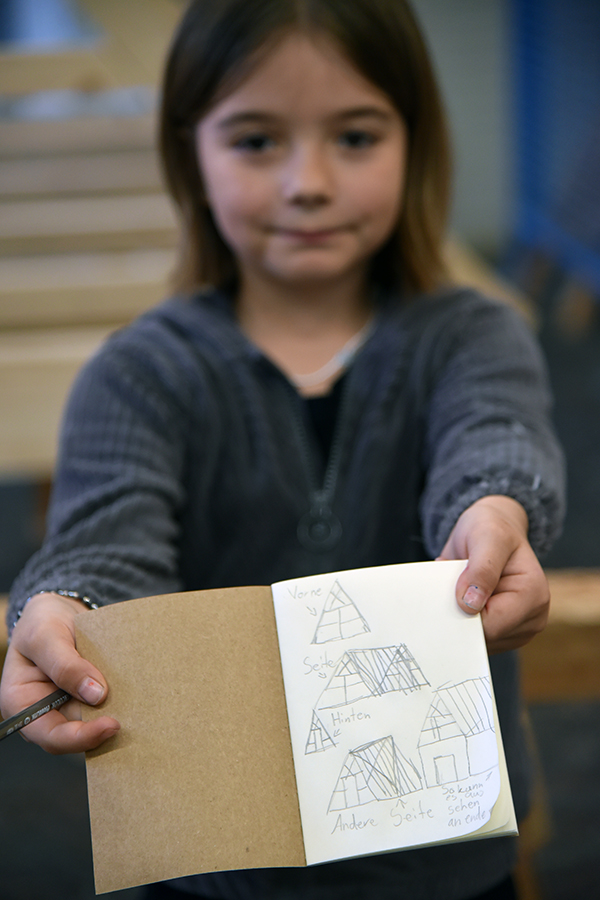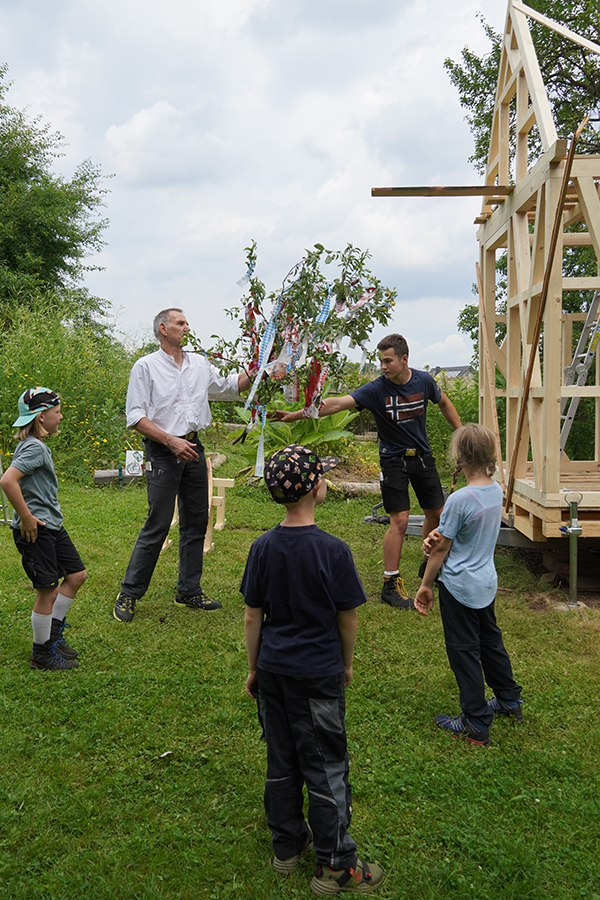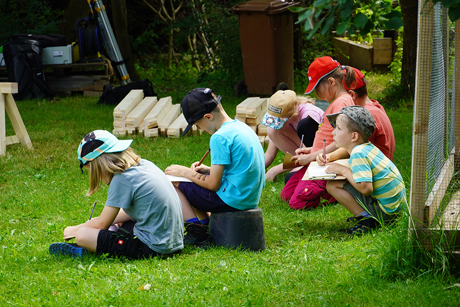 Nicht nur, dass es nun ein trockenes Plätzchen für unser Werkzeug, Rasenmäher und so weiter gibt – Die Kinder sind während dem Lebenspraktischen Tag beim Aufrichten des Schuppens dabei! Wir schauen genau hin, was alles passiert und zeichnen in unserem Bauzeichenbuch!