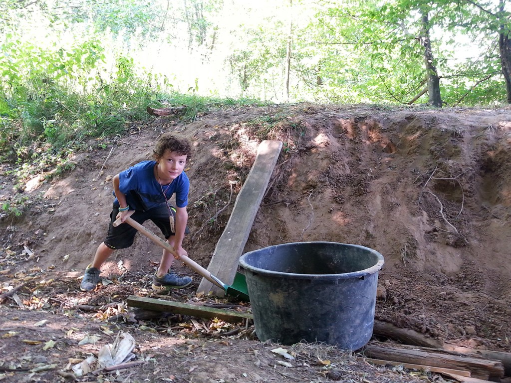 Unser Lehmofen während der Entstehungsphase. Wir graben den Lehm direkt vor Ort aus dem Boden, stampfen ihn ein, die Innere Hülle entsteht über einem Haufen aus Sand. Bald feiern wir Richtfest und schützen unser Werk mit einem gut gedeckten Dach!