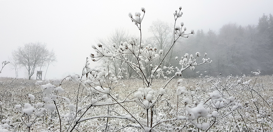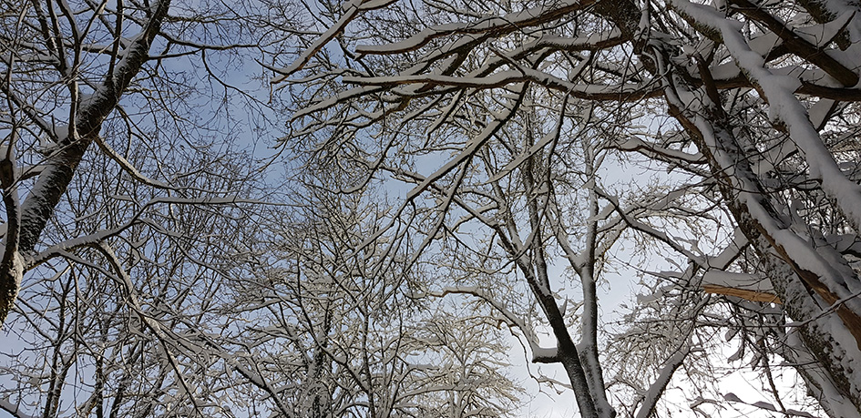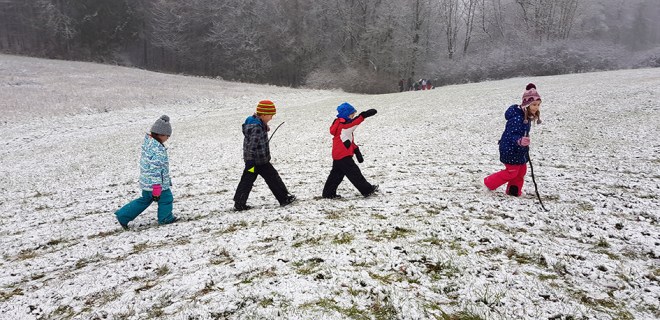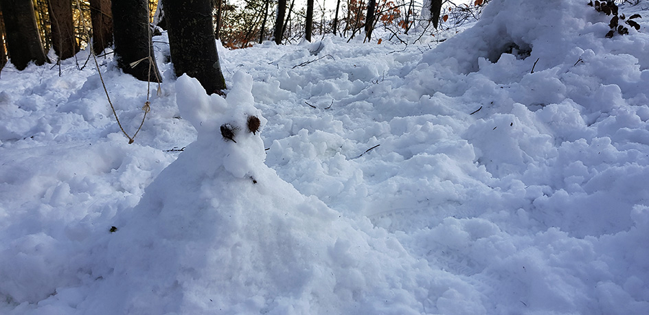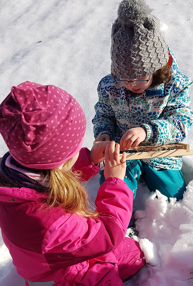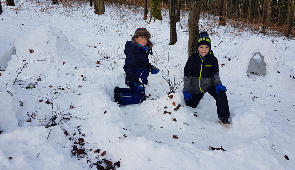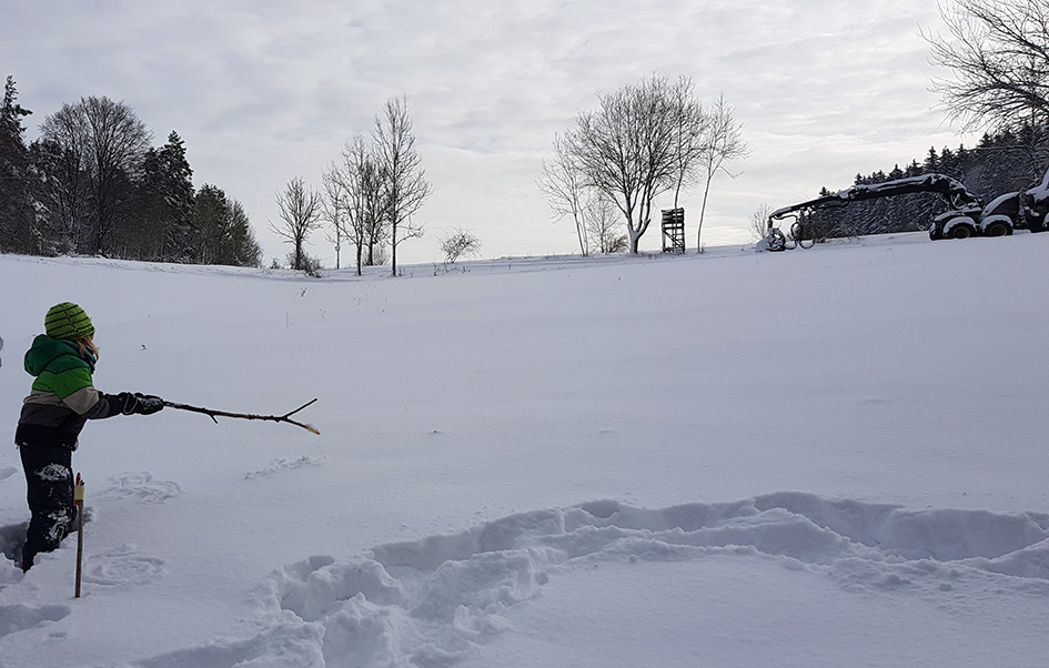 Wir laufen zu unserem Lager- und Bauplatz, bleiben heute allerdings gerne auf der weißen Wiese. Hier scheint die Sonne und uns fallen keine schneebeladenen Äste auf den Kopf.