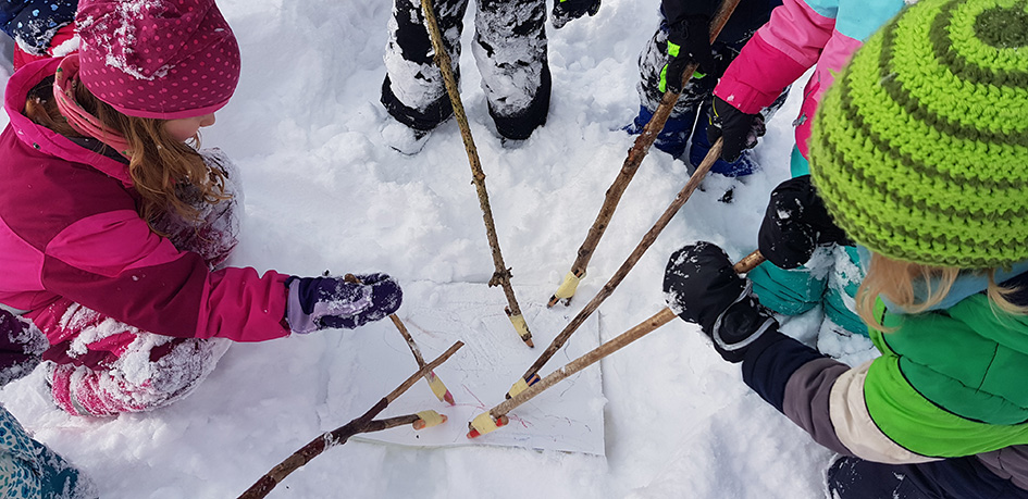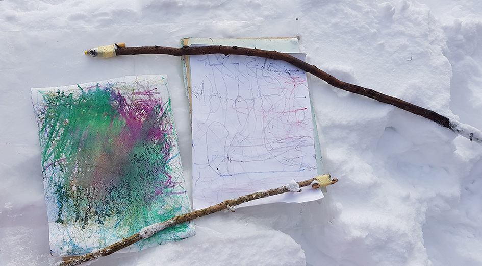Zum Abschluß zeichnen wir den tief verschneiten Winterwald mit langen Kreide-Stöcken. Das ist eine neue und experimentelle Technik für uns – aber es geht auch mit Handschuhen und im Schnee. Zeichnen anders!