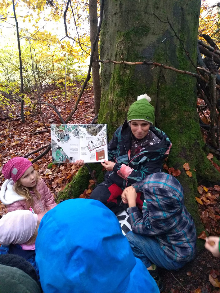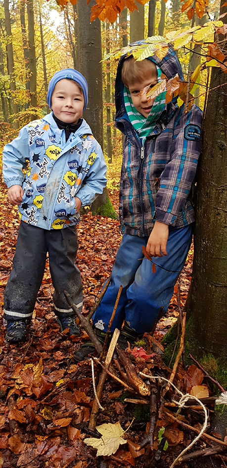 Tag 06 Wieder sind wir fast komplett,- 14 von 15 Kindern sind dabei – und das in der herbstlichen Schnupfenzeit! Diesmal sind wir schnell an unserem Lagerplatz, wollen wissen wie Waldipeter, Woozel und Frau Lang-Ast den heutigen Regen so finden. oben angekommen, erzählen und zeigen wir die Geschichte von „Kubbe, und seinem Waldmuseum“.