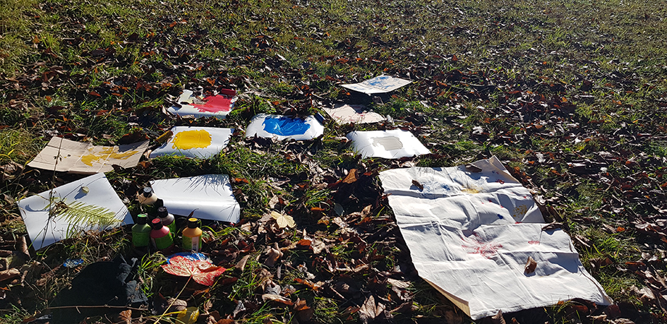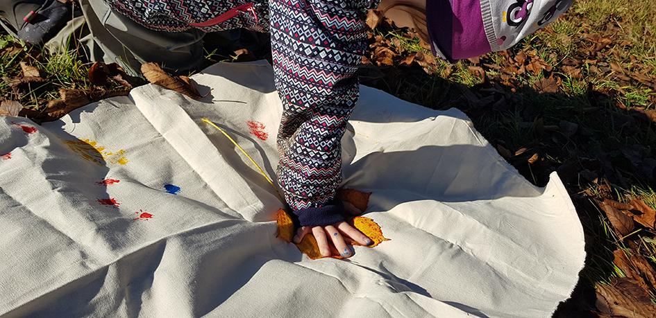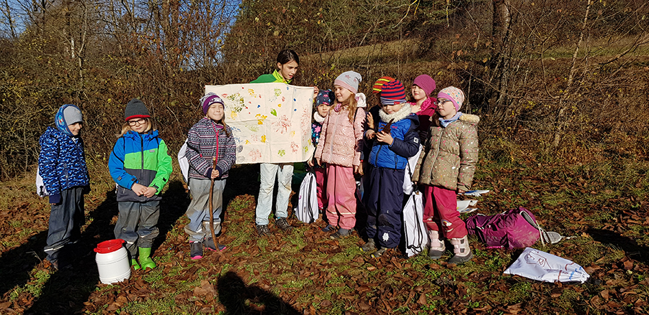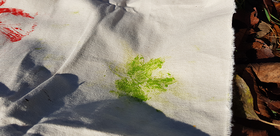 Oben am Waldrand lernen wir noch eine andere Technik kennen, wie es möglich ist, Abdrücke zu machen: Wir suchen verschiedenste Blätter, Gräser, Blumen und bedrucken damit ein Stück Leinwand. Karin zeigt uns, wie man richtig mit den Linoldruckrollen und der ‚Farbe umgeht.