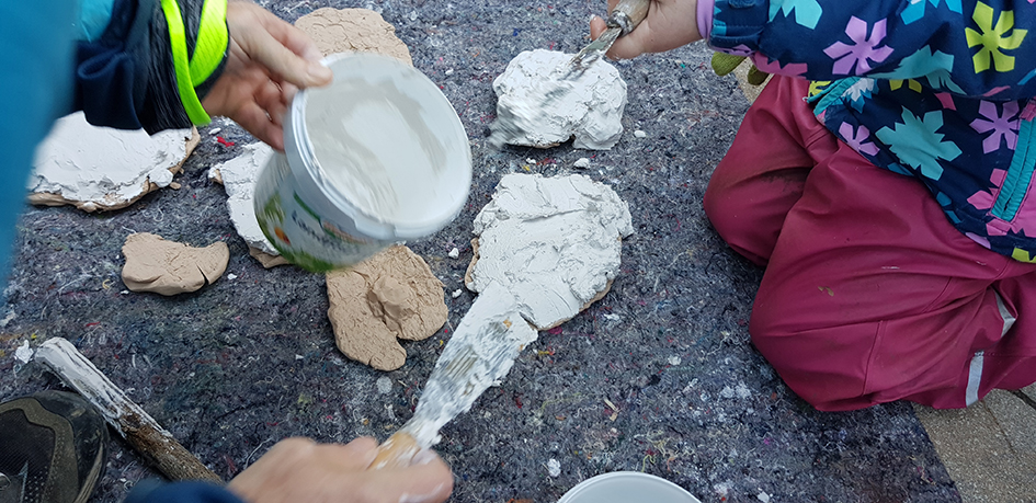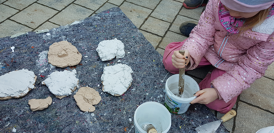 Doch bevor wir uns in den Wald aufmachen, schauen wir nach den Tonabdrücken. Heute machen wir einen Abguß der Rindenabdrücke mit Ton. Der Gips trocknet sehr, sehr schnell – wir müssen rucki-zucki arbeiten.