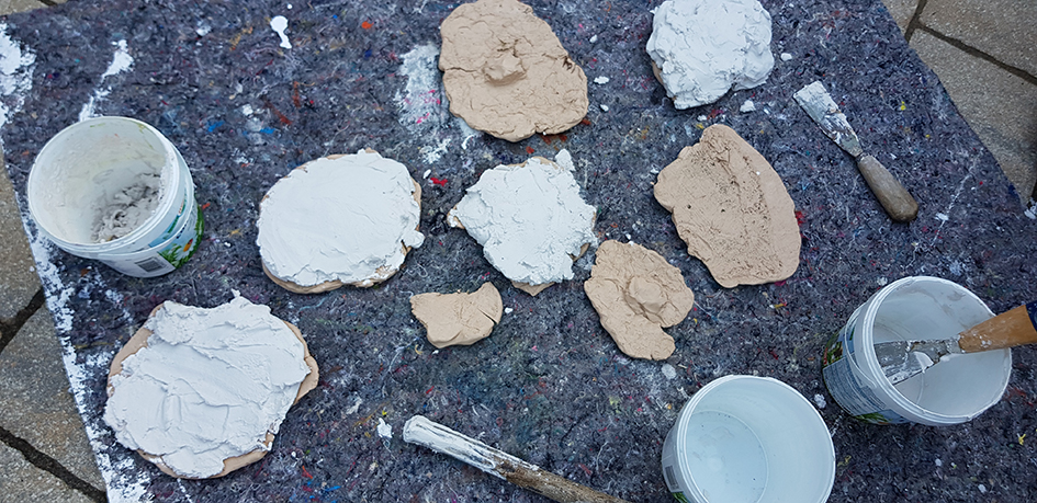 Tag 09 Zu allererst versuchen wir unsere Gipsabdrücke aus dem Ton zu lösen! Spannend!!! Aber es gelingt uns! Fast alle sind ganz geblieben. Aus den Negativabdrücken sind echte Gipsreliefs entstanden!