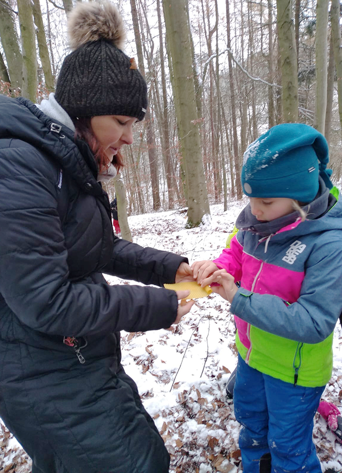Was ein Spurensuchtag – bis hinauf zu unserem Lagerplat finden wir Spuren von Rehen, Mardern Füchsen, Katzen und Eichhörnchen! Oben angekommen wollen wir es für unsere Geister vorweihnachtlich gemütlich machen – dafür kann jeder von uns eine Kerze aus Bienenwachs formen. Im Kreis begrüßen wir bei brennenden Kerzen Waldipeter, Woozel und Frau Langast. Wie schön!