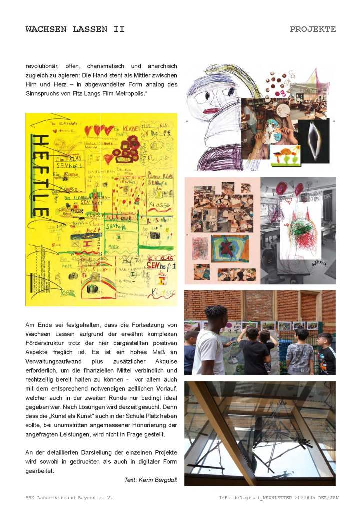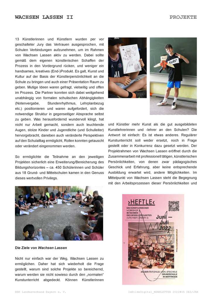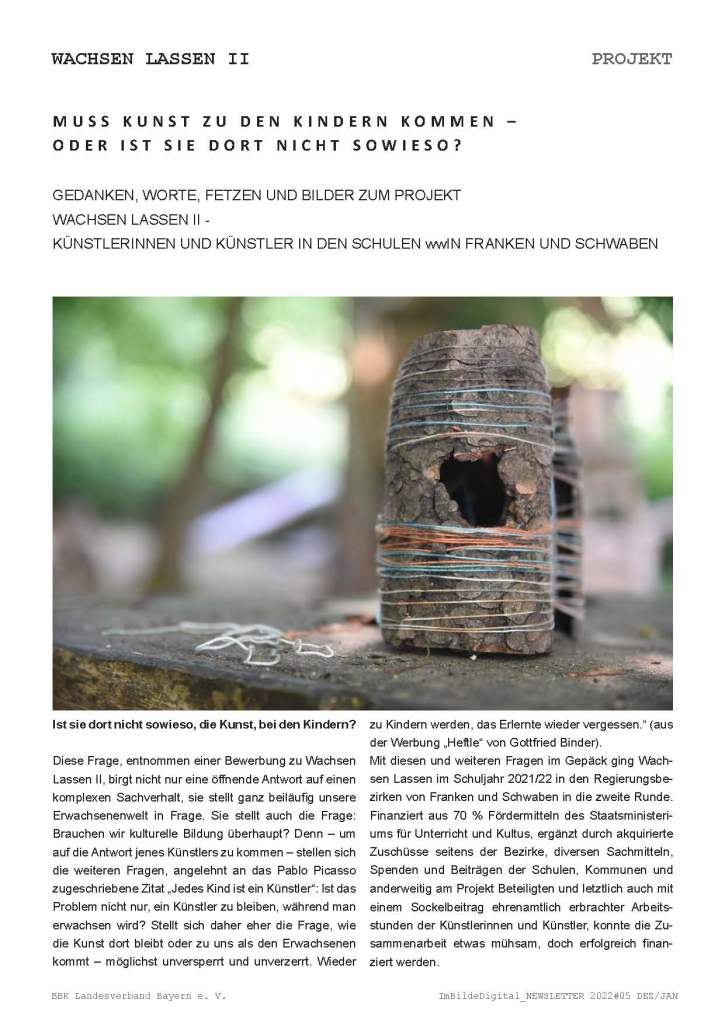 Geruch von Wald und Erde, Wind, der durch das Schilf surrt, so auch vereinzelte Moskitos, lachende Jugendliche, Hammerschläge und Sägegeräusche, Jugendliche, die sich ein ruhiges Plätzchen zwischen Bäumen oder am Rand der Wiese gesucht haben, um dort vertieft ein Bauwerk zu flechten; Andere sitzen auf einer Plattform im Baum und beschäftigen sich mit ihrer Konstruktion, die es zu überdenken gibt. Dazwischen sind immer wieder Rufe nach der Schere, der Säge, der Schnur oder nach Beratung zu vernehmen. Behausungsvisionen entstehen, die Beteiligten sind mit Herzblut, Leidenschaft und Ausdauer dabei und erfahren professionelle, künstlerische Unterstützung.So oder so ähnlich kann mit kurzen Worten eine Arbeitssituation zwischen einem Künstler, einer Schulklasse und deren begleitenden Lehrkräften beschrieben werden, die in diesem Fall sogar außerhalb der Schulräume stattfinden konnte. Einige viele andere Arbeitssituation gab es ebenso, ob im Schulhaus oder anderswo, im Umgang mit Papier, Büchern, Holz, Skulptur, Video, Klang und, und, und deren begleitenden Künstlerinnen und Künstlern.Erneut konnten sich im Schuljahr 2021/22 eine bemerkenswerte Anzahl an Kindern und Jugendlichen aus Grund- und Mittelschulen in Franken und Schwaben an der Zusammenarbeit mit den ausgewählten Künstler*innen erfreuen, um der Freiheit im kreativen Denken und Handeln, ohne Notendruck und dennoch mit Ziel und Struktur, zu begegnen. Gemeinsam mit begeisterten Lehrkräften und deren Schulleitungen gelang es, Wachsen Lassen Zwei erneut auf den Weg zu bringen, damit (mehr) Kunst zu den Kindern kommt und veränderte Perspektiven ermöglichen kann. Ein Dank geht an Alle, die aktiv im Hintergrund dieses besondere Projekt ermöglichen. Karin Bergdolt