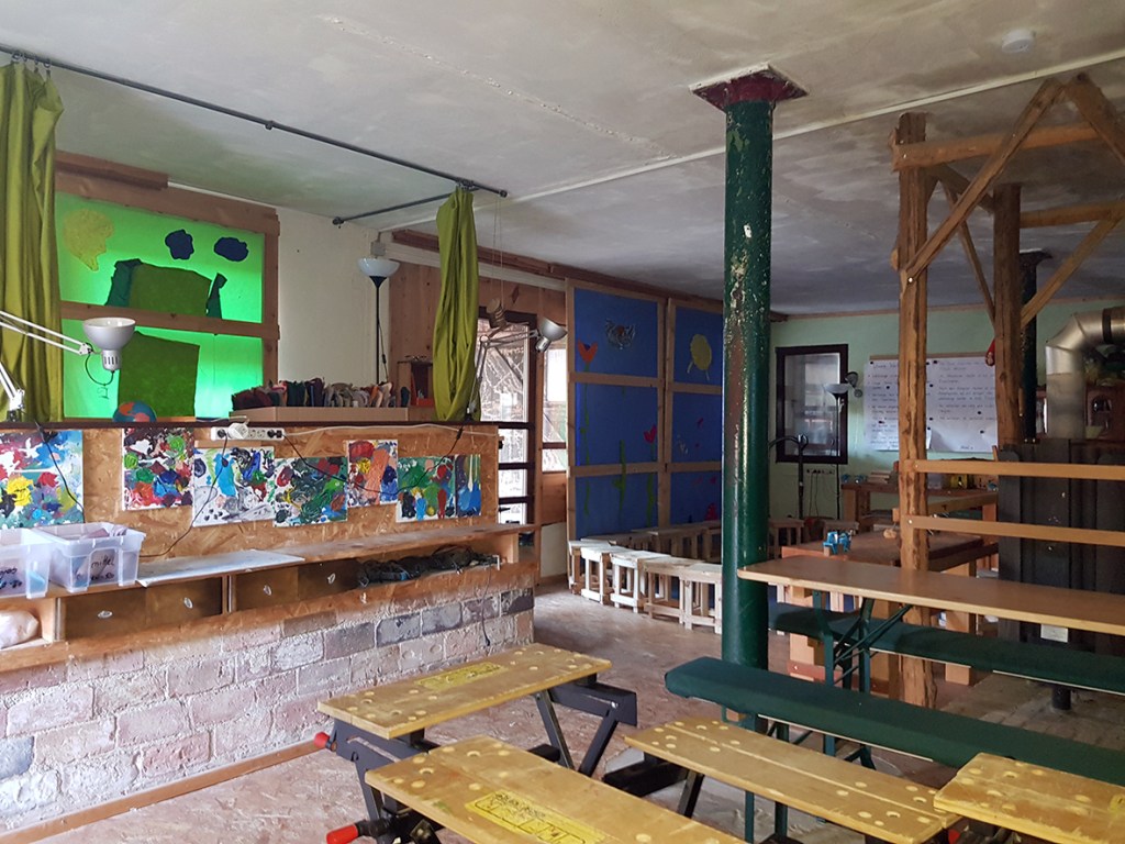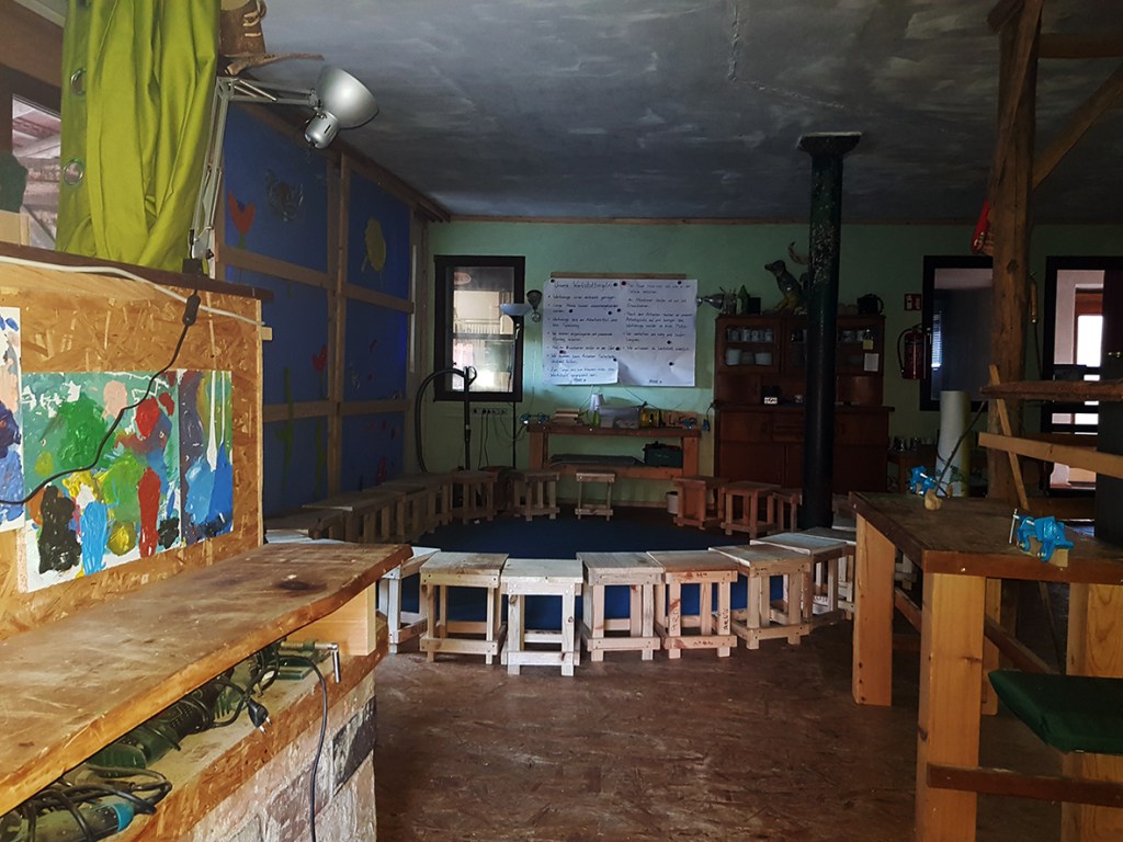 Hier verbirgt sich ein gut ausgestatter und gemütlicher Arbeitsraum! Wo ehemals Kühe standen, befinden sich Werkbänke, ein Sitzkreis aus selbst gebauten Hockern, ein wärmender Holzofen und allerlei Material und Werkzeug.